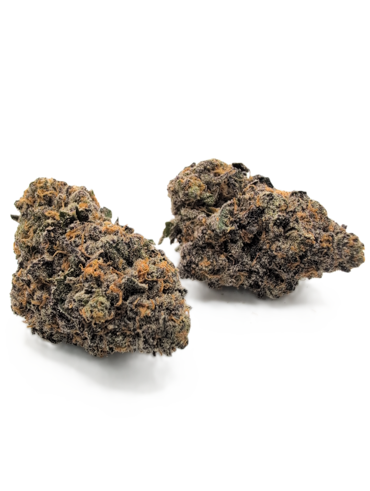 - Appearance: Dense buds that are deep emerald green, with purple-tinted crystals, orange hairs, and often surrounded by purple leaves.